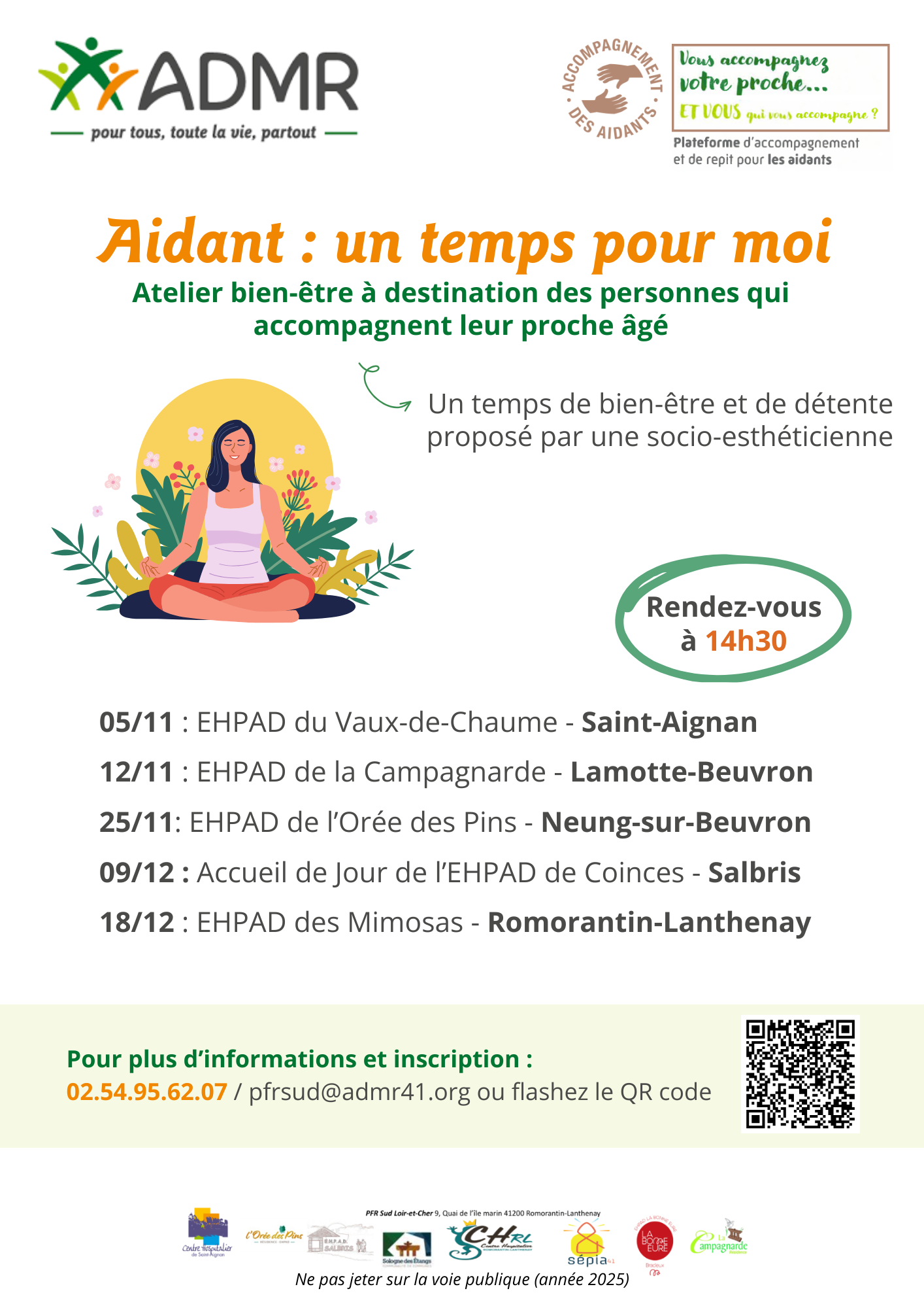 Comme chaque trimestre, la Plateforme d’accompagnement et de répit pour les aidants organise un atelier à destination des aidants familiaux du Sud du Loir et Cher. Pour les mois de novembre et décembre, afin d’offrir un appui dans un moment de l’année parfois difficile pour les accompagnants familiaux, nous proposons un atelier « Bien-être ». Cet atelier a visée de relaxation sera animé par une socio-esthéticienne pour un temps d’auto-massage.