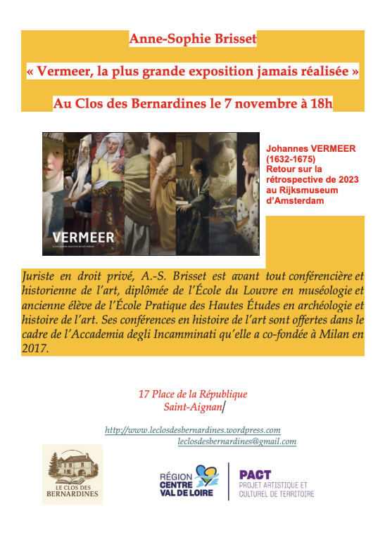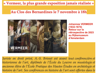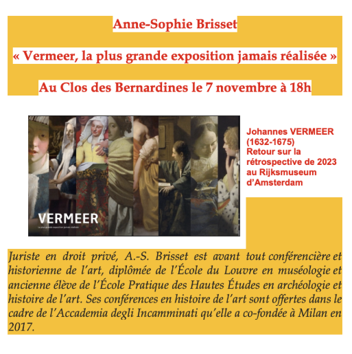Prochaine causerie, donnée par Anne-Sophie BRISSET, historienne de l'art, diplômée de L'Ecole du Louvre en muséologie et ancienne élève de l'Ecole Pratique des Hautes Études en archéologie et histoire de l'art,