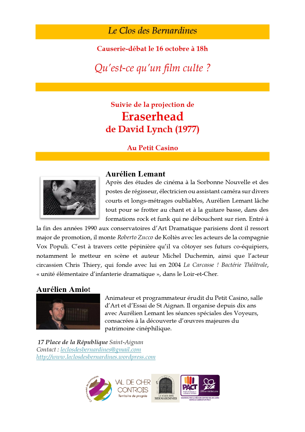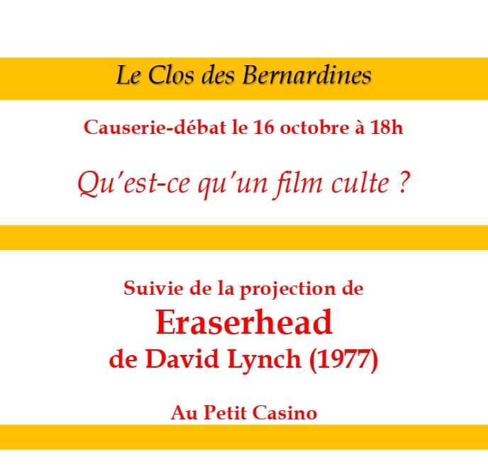 La causerie sera suivie de la projection du film Eraserhead de David Lynch (1977) au Petit Casino à 20h30.
