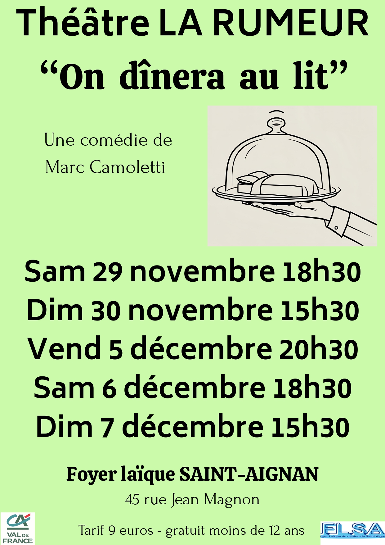 La troupe de théâtre "La rumeur" donnera des représentations de la comédie de Marc Camoletti "On dînera au lit", au Foyer laïque de Saint-Aignan du 29 novembre 2025 au 07 décembre 2026.